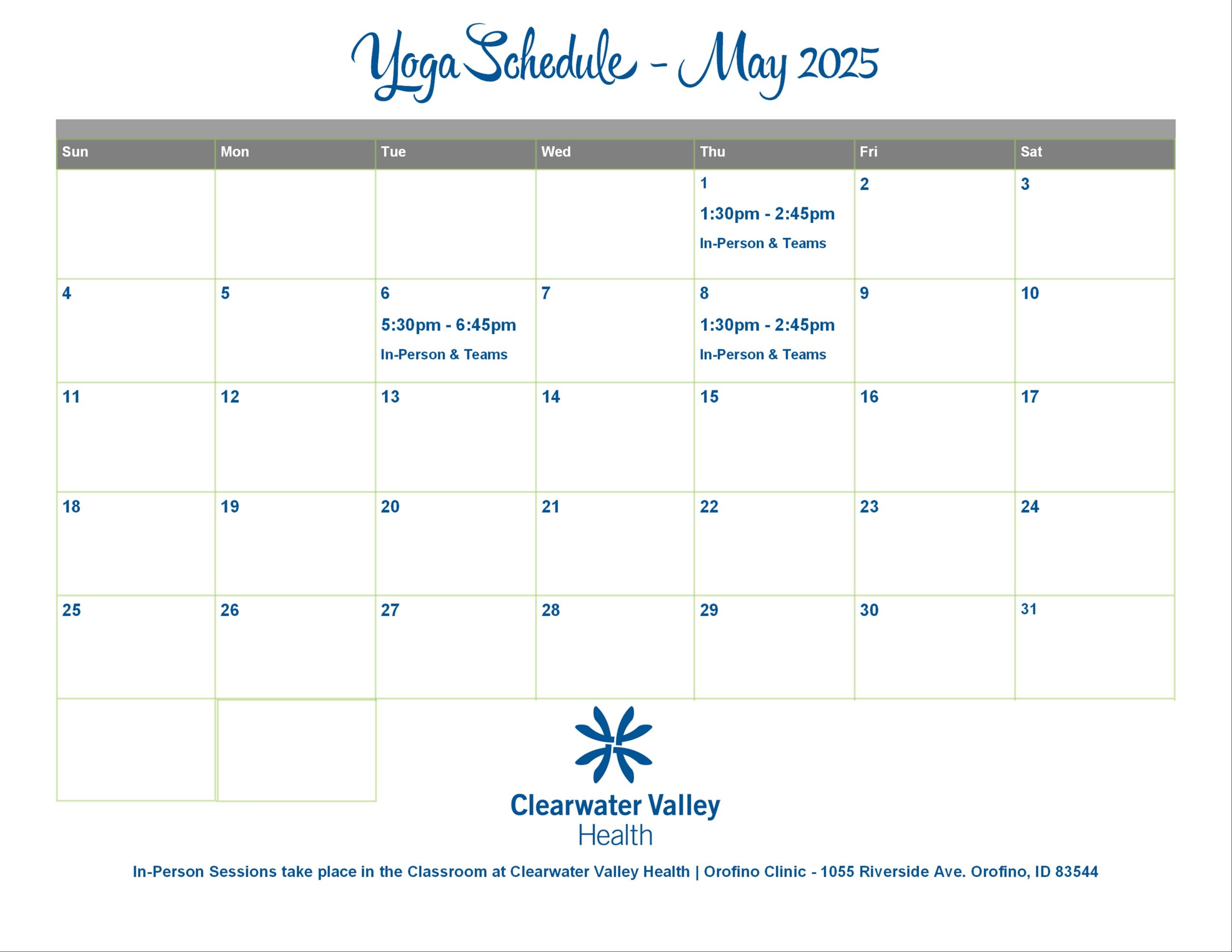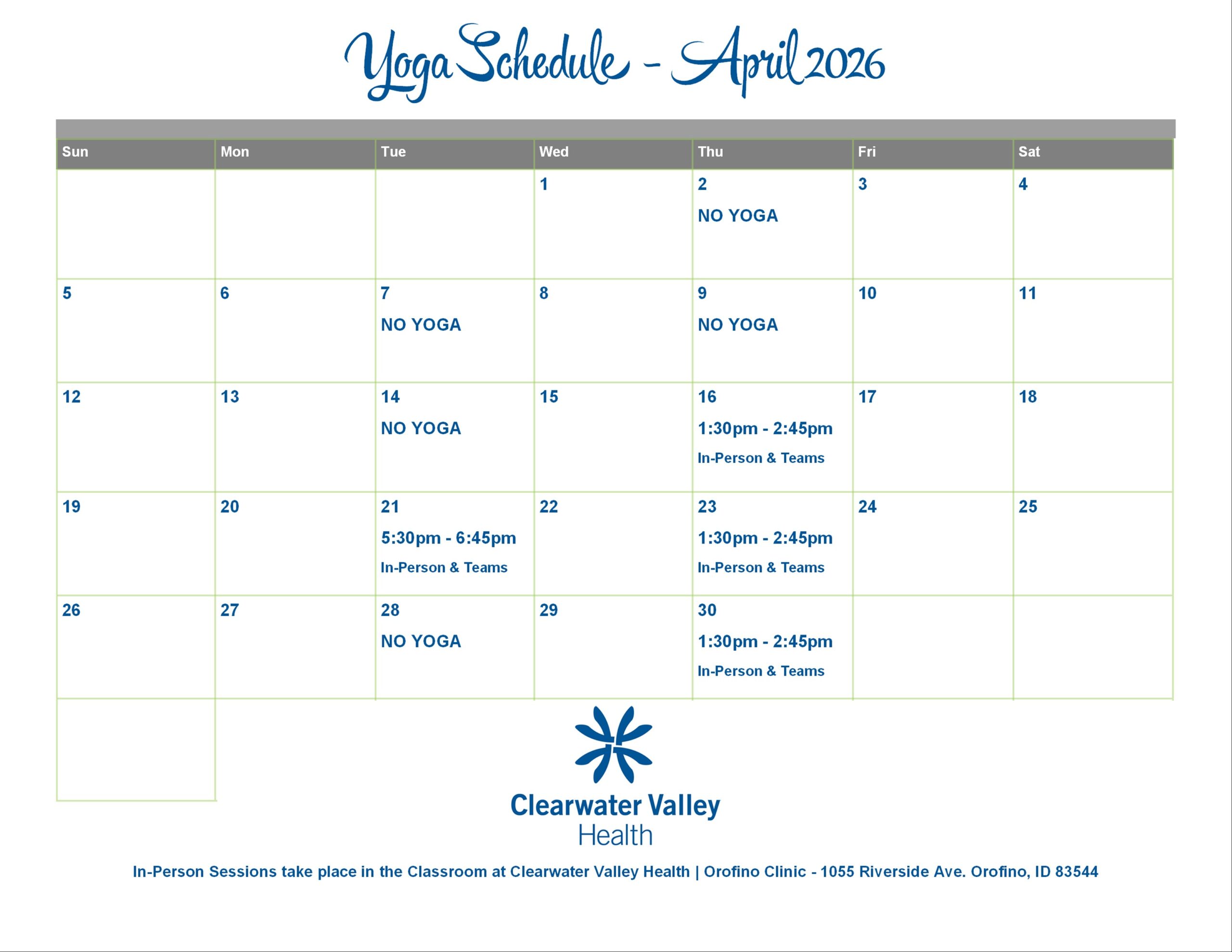Yoga classes will be offered both in-person and virtually, twice a week, most Tuesdays and Thursdays: